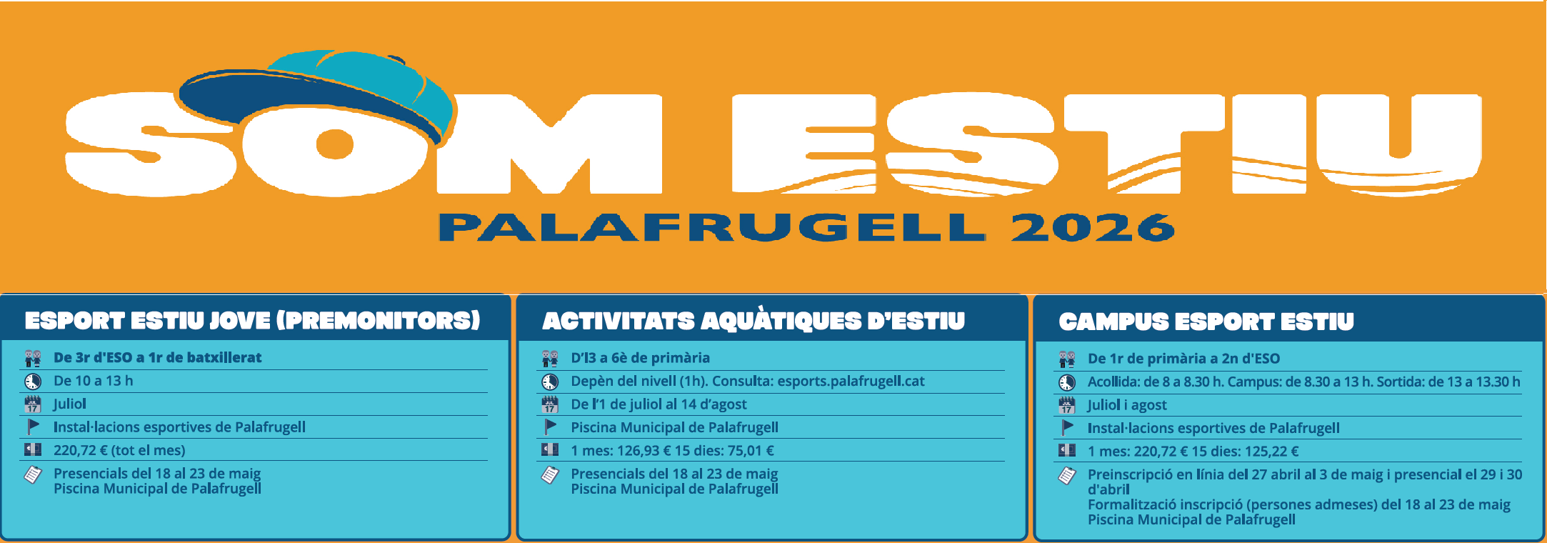 Presencials a la Piscina Municipal de Palafrugell, del 14 de maig fins a set dies abans del començament de l’ activitat (amb un 25% de descompte).